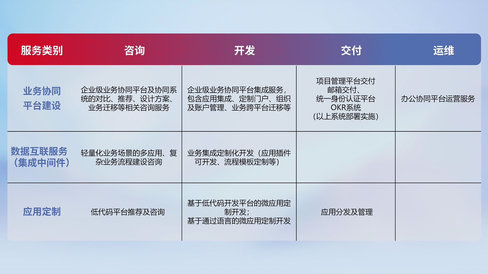 针对钉钉、、、企微、、IDaas等平台级产品提供产品的规划、、、、方案、、、交付、、、定制化开发等服务,,,,实现如统一协同办公、、、、智能客户服务、、混合会议管理、、、、智能数据查询、、等业务场景,,,,实现数字化转型。。
