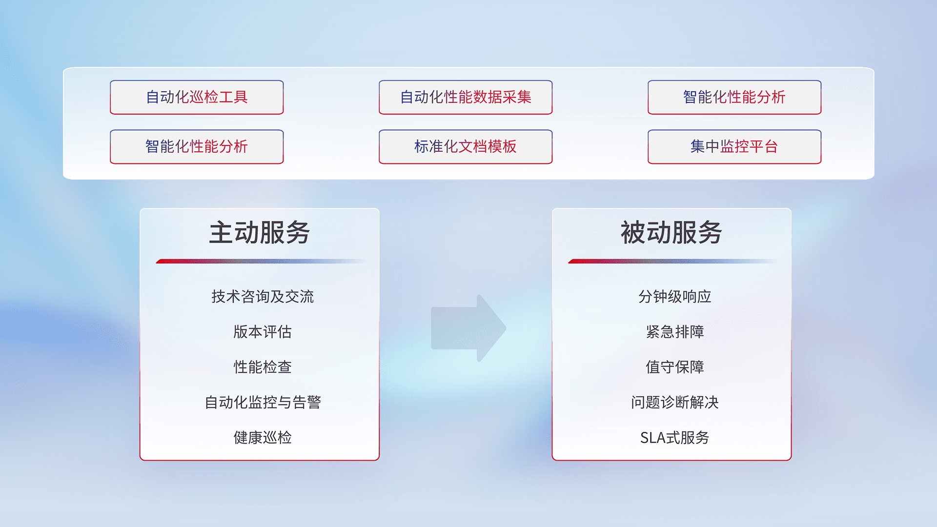 智能化工具和标准化文档,,,保障服务质量,,,提供主动服务(包含技术咨询、、、版本评估、、性能检查、、、、自动化监控与告警、、健康巡检)和被动服务包含(分钟级响应、、、紧急排障、、、值守保障、、、问题诊断解决、、、SLA服务)。。。